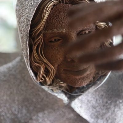 The Sculpture shows a transfiguration. It shows how Mary concealed in a flower, transfigures and materializes, reaching through the invisible wall between the spiritual world and ours. Reaching forward to turn tragedy into triumph.